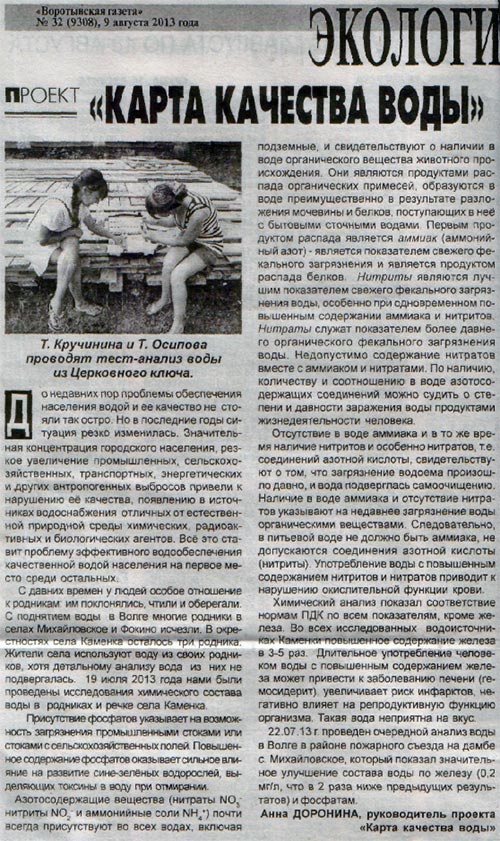 Руководитель группы проекта «Карта качества воды» из села Михайловское Анна Доронина в заметке 9 августа рассказала читателям «Воротынской газеты», чем опасно для людей и животных превышение ПДК по некоторым веществам. Заметка доступна по ссылке .