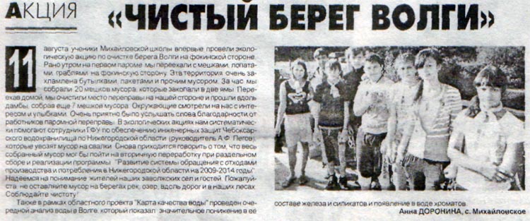 Очередной отбор пробы воды в Волге группа из села Михайловское совместила с не менее полезным делом – акцией по очистке берега реки от мусора. Ребята собрали 7 мешков мусора, а заметку об этом опубликовала «Воротынская газета»