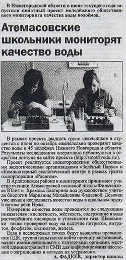 Ардатовская районная газета «Наша жизнь» опубликовала заметку «Атемасовские школьники мониторят качество воды».