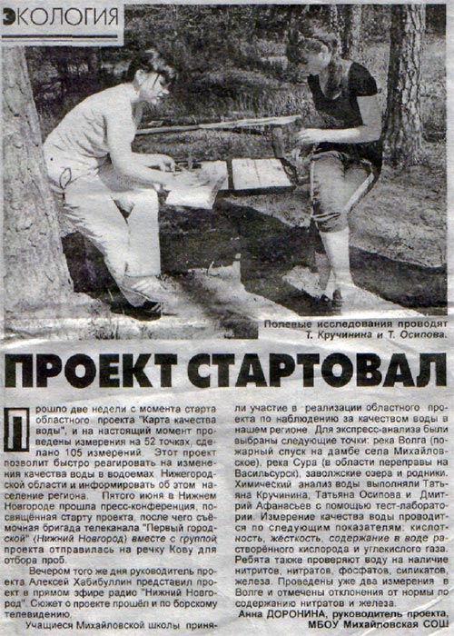 «Воротынская газета» продолжает следить за работой михайловской группы проекта «Карта качества воды». Заметка «Проект продолжается» опубликована в газете 19 июня, она сообщает читателям о том, что качество воды в Волге в районе дамбы села Михайловского не вызывает опасений