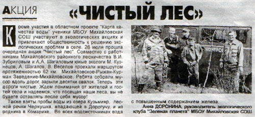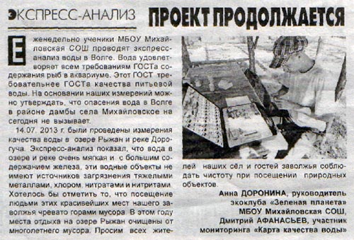 Ребята, исследующие качество воды в Волге и водоёмах в районе села Михайловского Воротынского района, летом занимаются не только этим. 26 июля ребята поучаствовали в акции «Чистый лес», проехав 62 километра и собрав весь мусор вдоль дорог. По пути ребята не забыли о проекте и замерили качество воды в озере Кузьмияр, реке Чернушке и в роднике в Комарихе. Заметку об этом опубликовали в «Воротынской газете», в выпуске от 2 августа.